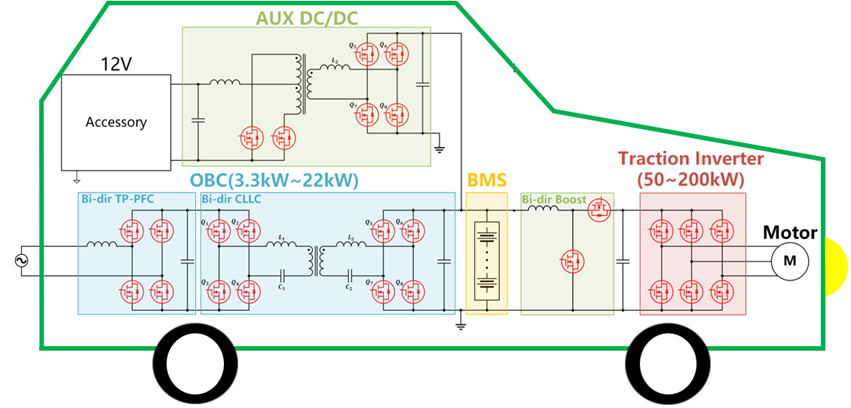 目前市场主流的OBC 设计采用两级式变换器,前级往往采用交错式图腾柱PFC ,图腾柱PFC是一种双向AC/DC 和DC/AC 变换器,后级采用CLLC ,也是一种双向变换器,使用SJ MOS 在副边进行二次整流。 这样的双向OBC 可以既为电动车电池组充电,也可以将电池的能量反馈给交流电网。